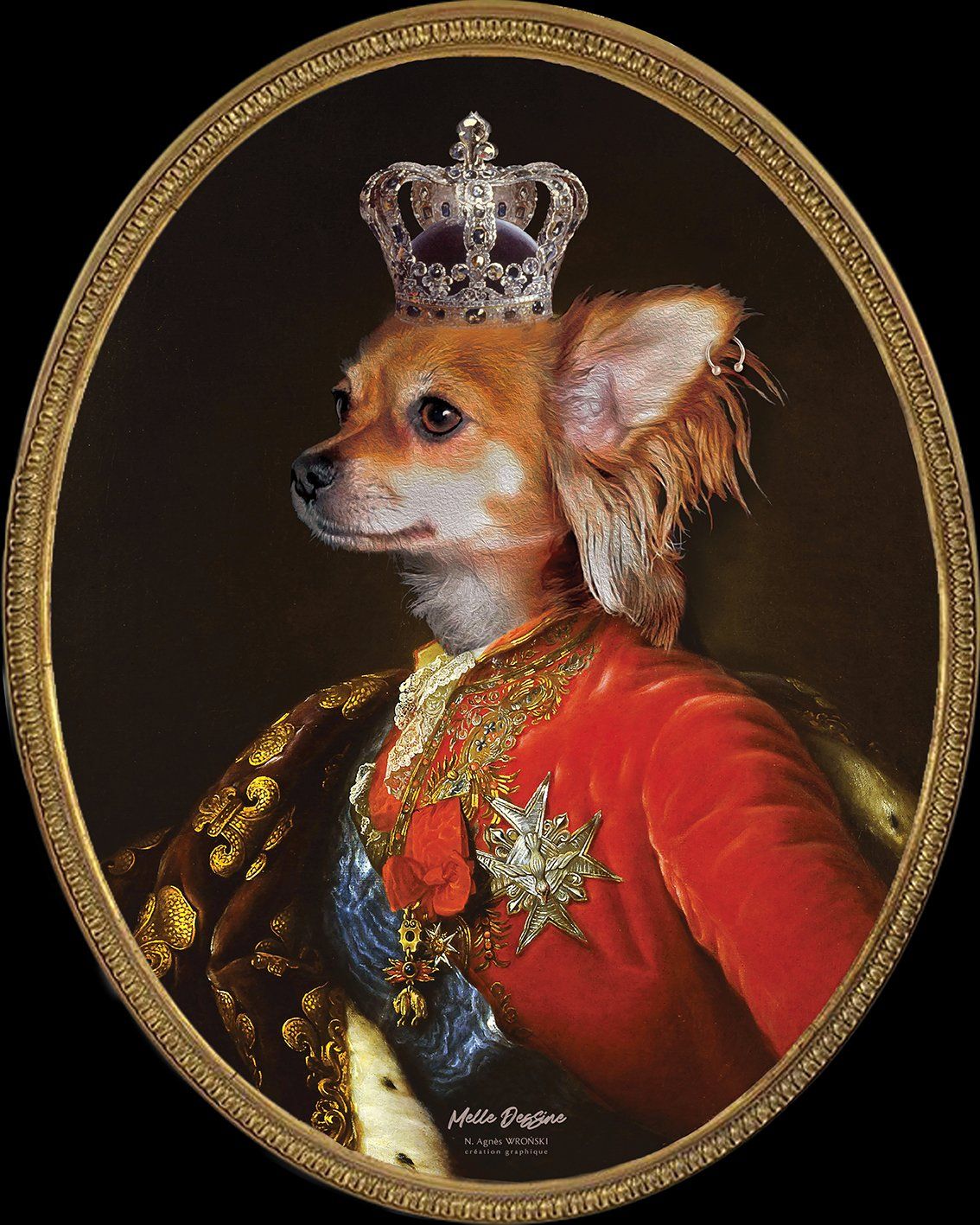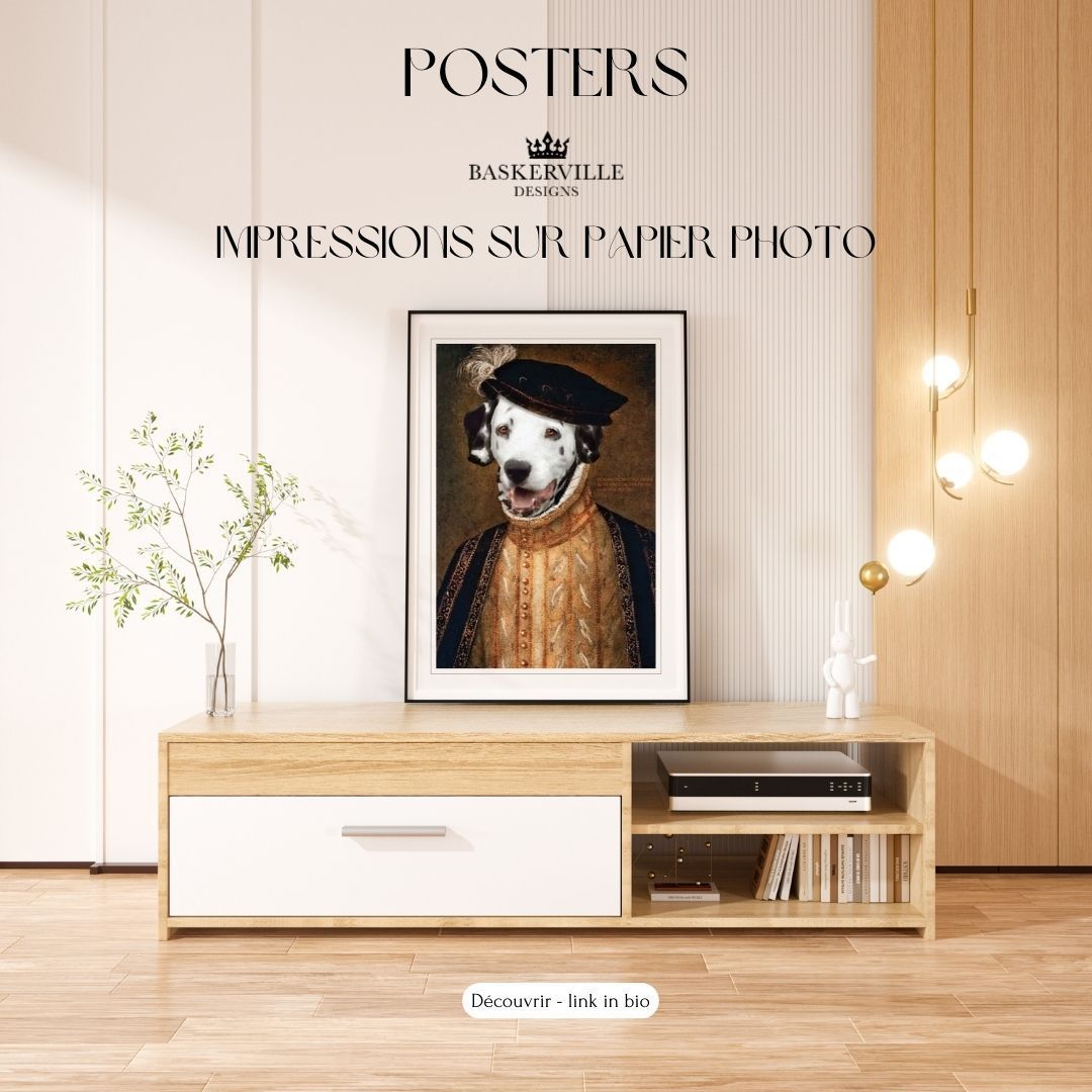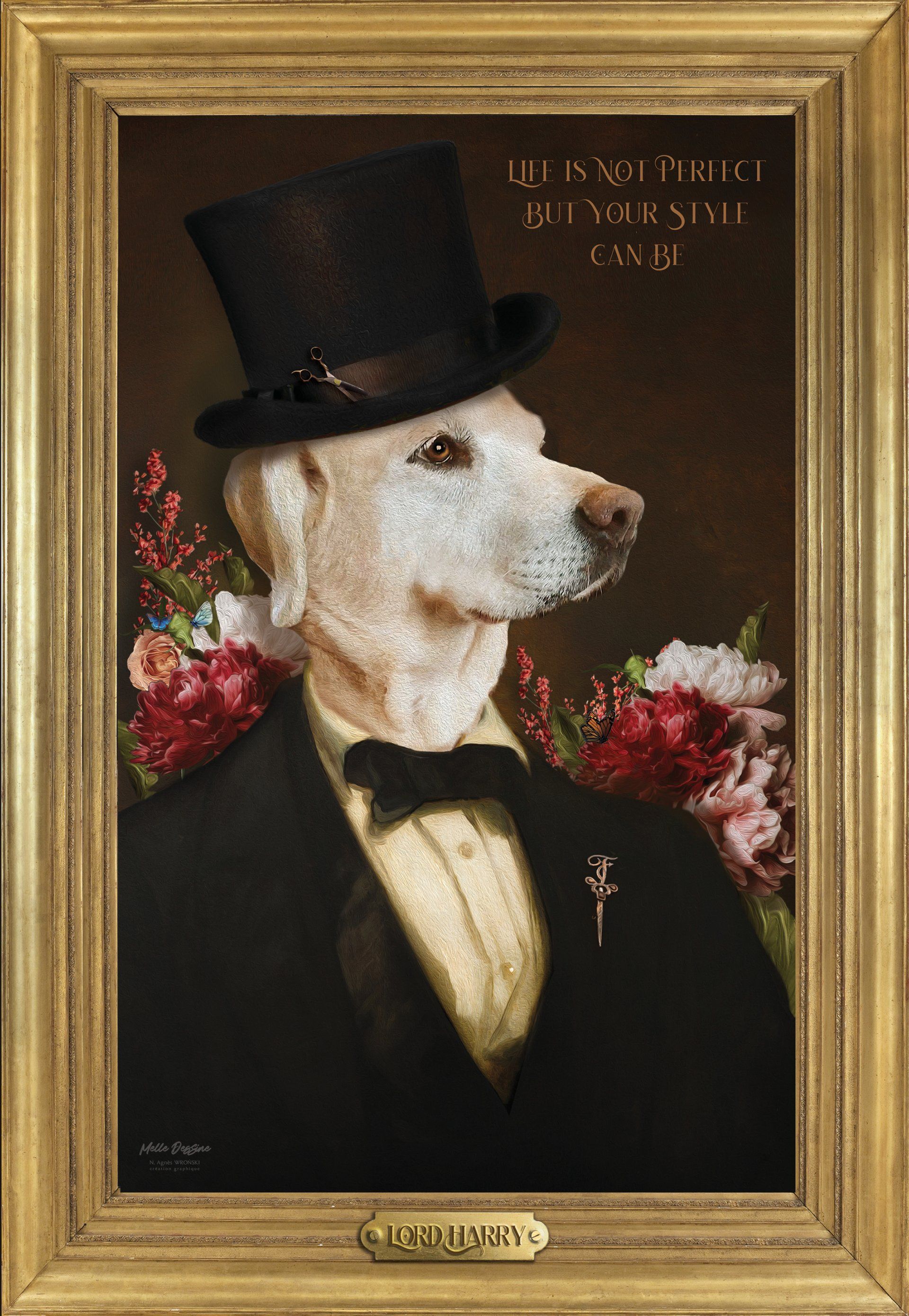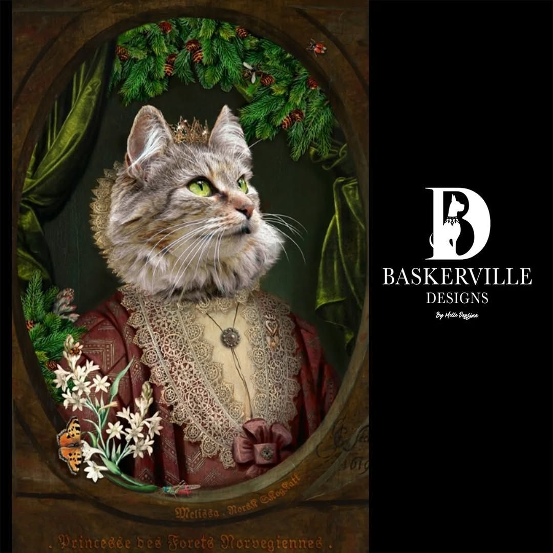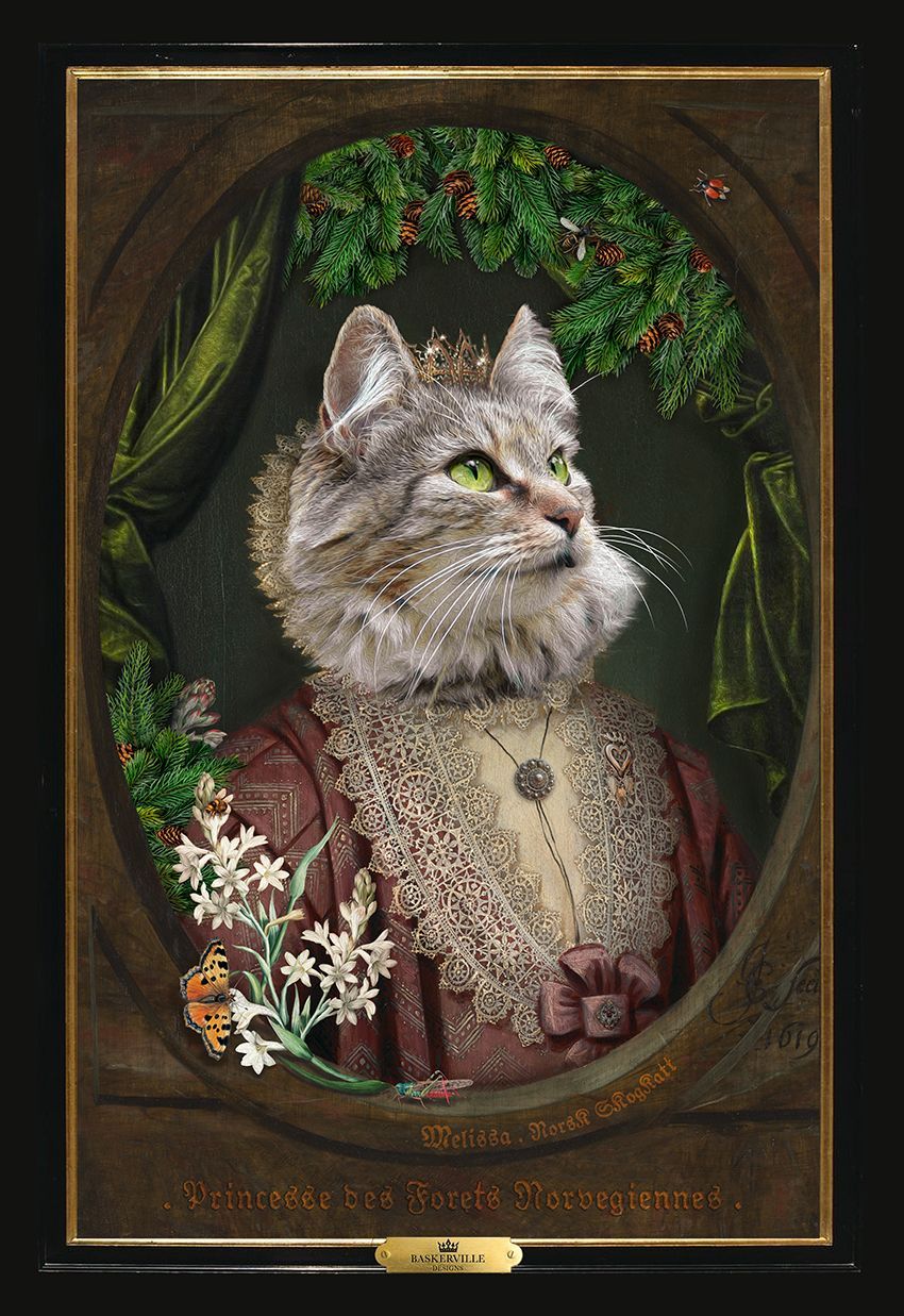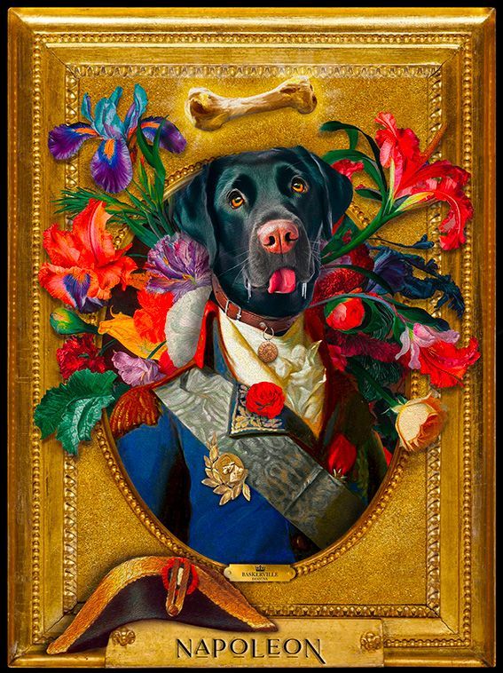 - Après validation, la création demande un temps de conception auquel nous apportons le plus grand soin dans un souci de réalisme et de qualité : montage photo, retouches, ajouts de pelage, accessoires, composition des fonds, cadre en trompe l'oeil, mise au format A3 ou A2