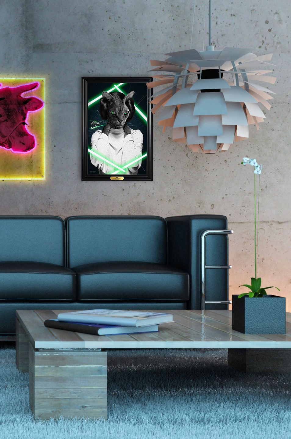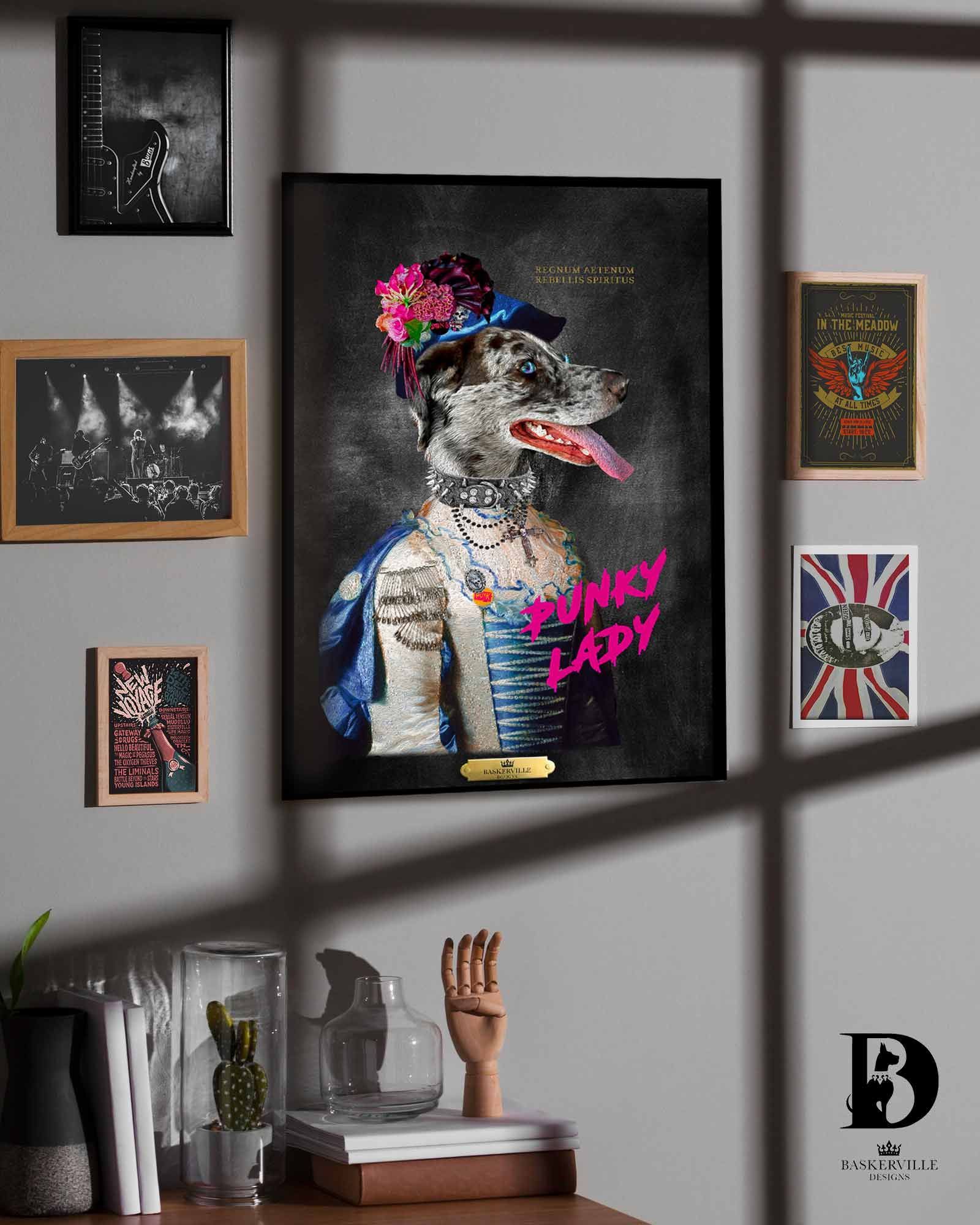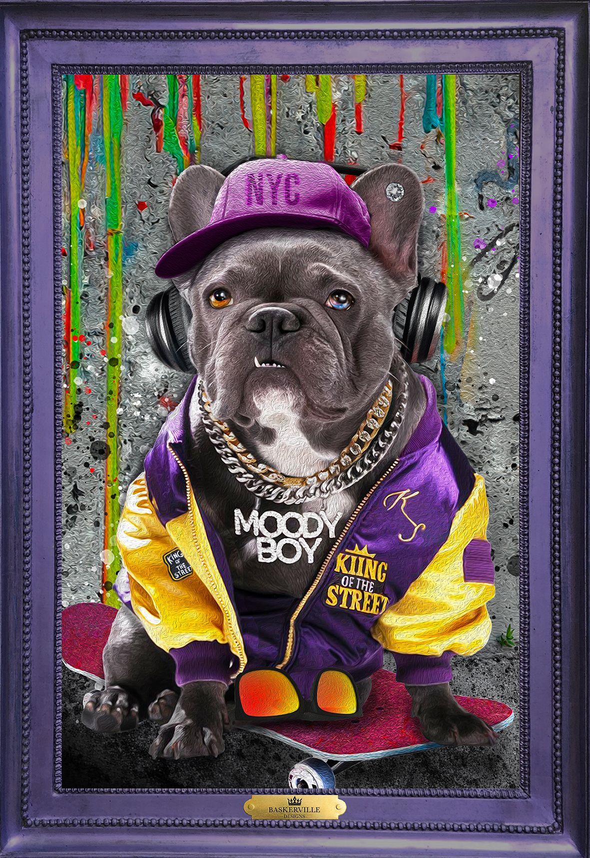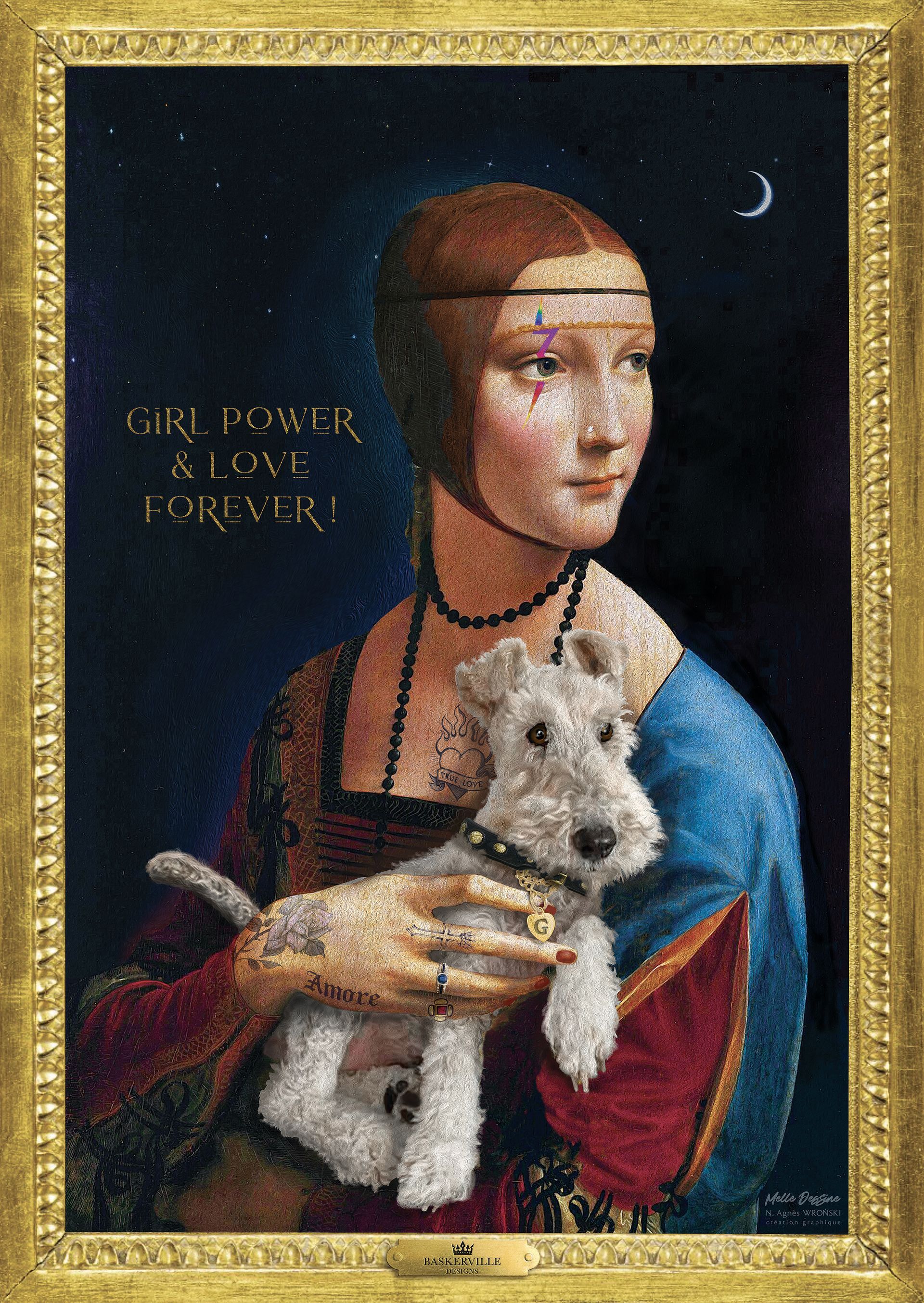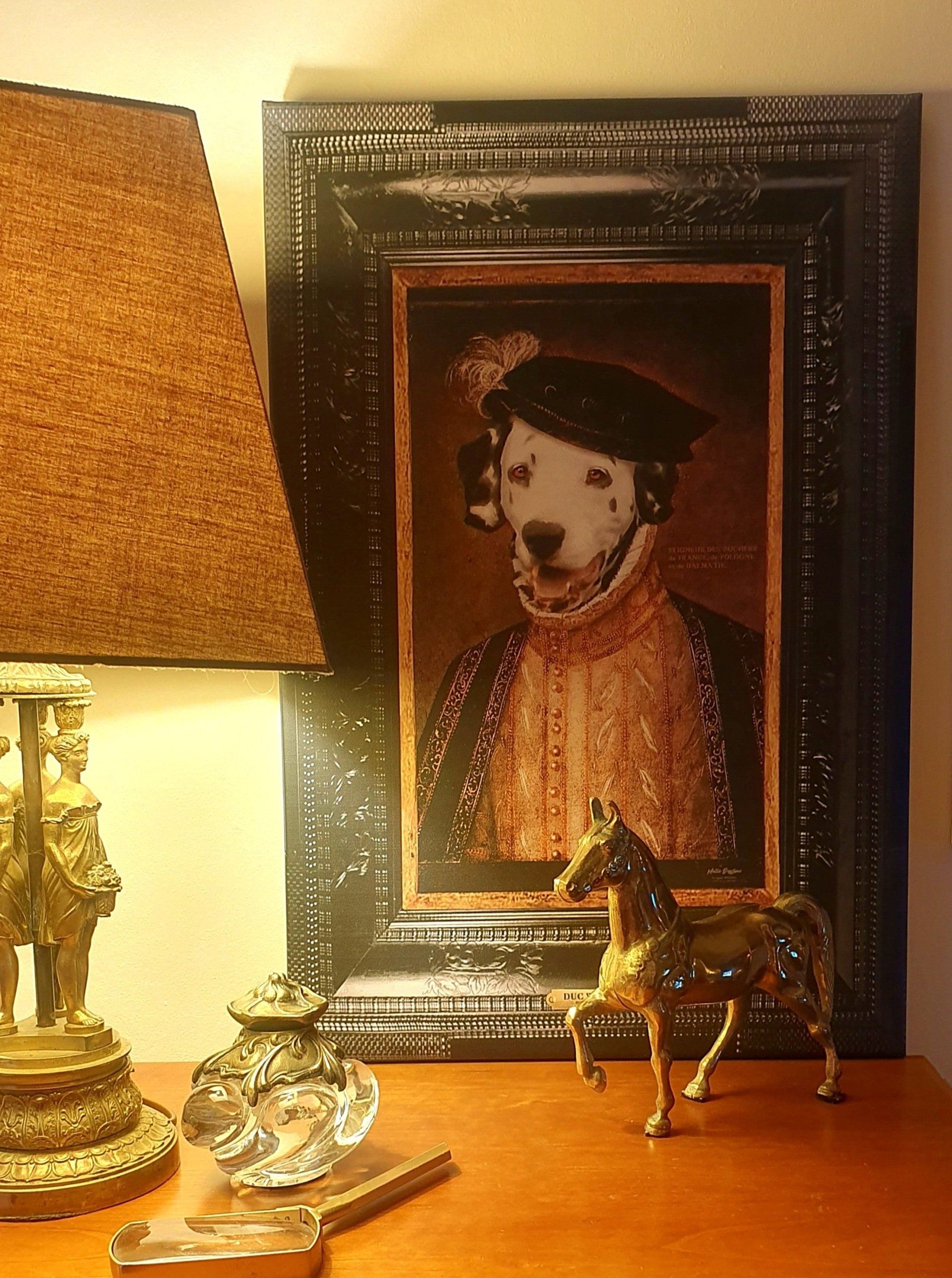 - Après validation, la création demande un temps de conception auquel nous apportons le plus grand soin dans un souci de réalisme et de qualité : montage photo, retouches, ajouts de pelage, accessoires, composition des fonds, cadre en trompe l'oeil, mise au format A3 ou A2