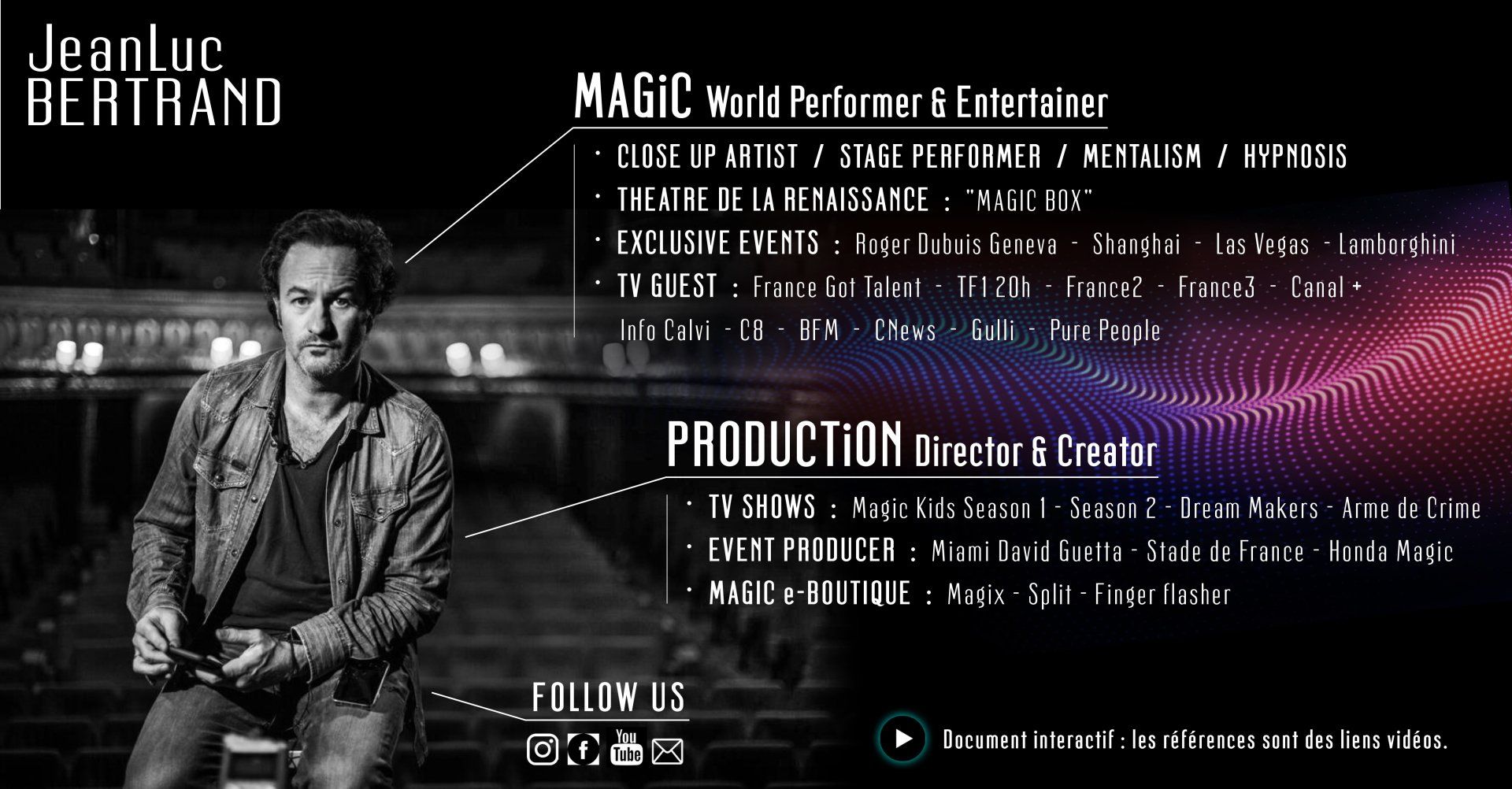 Références : Ville de Paris, BNF, Musée de l'Homme, Musée Cernuschi, Musée Quai Branly, France O' France Télévisions, Baskerville Designs, Kickstarter JLB DECK, PV Medica, Casino Barrières, Kitoki Déco, Les Opticiens Conseil, My Paris Immo, Maisons et Jardin, Citröen PSA, L'Ile aux Langues, JeanLuc Bertrand Close Up Magic Entertainment, Les Dames Augustines, Petite Pause Bakery, Nacres d'Eaux ...